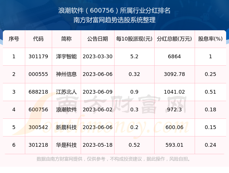 按照南方财富网趋势选股系统统计,浪潮软件所属行业为软件行业,软件行业分红排名情况如下表: