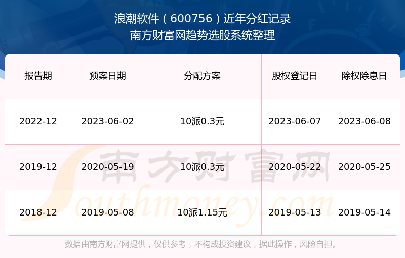 浪潮软件最新一次公布的分红方案为10派0.3元。本次权益分派股权登记日为2023年6月7日,除权除息日为2023年6月8日,派息日为2023年6月8日。