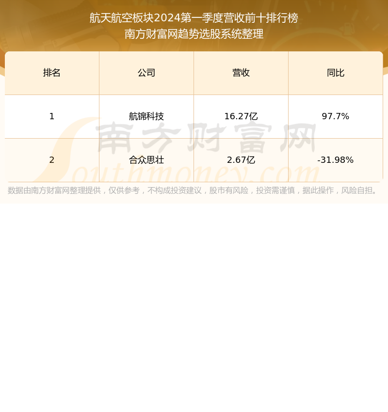 按照南方财富网趋势选股系统统计,该股所属板块为航天航空板块,该板块共有2只股票,中航重机2024第一季度营收在该板块中排名为第2名,该板块2024第一季度营收排名前十的股票如下表: