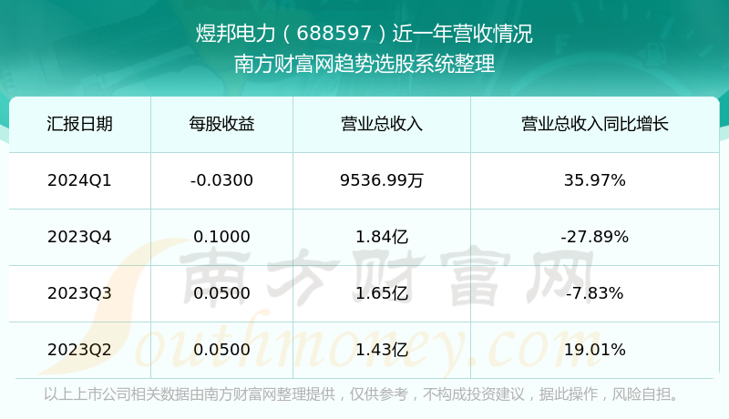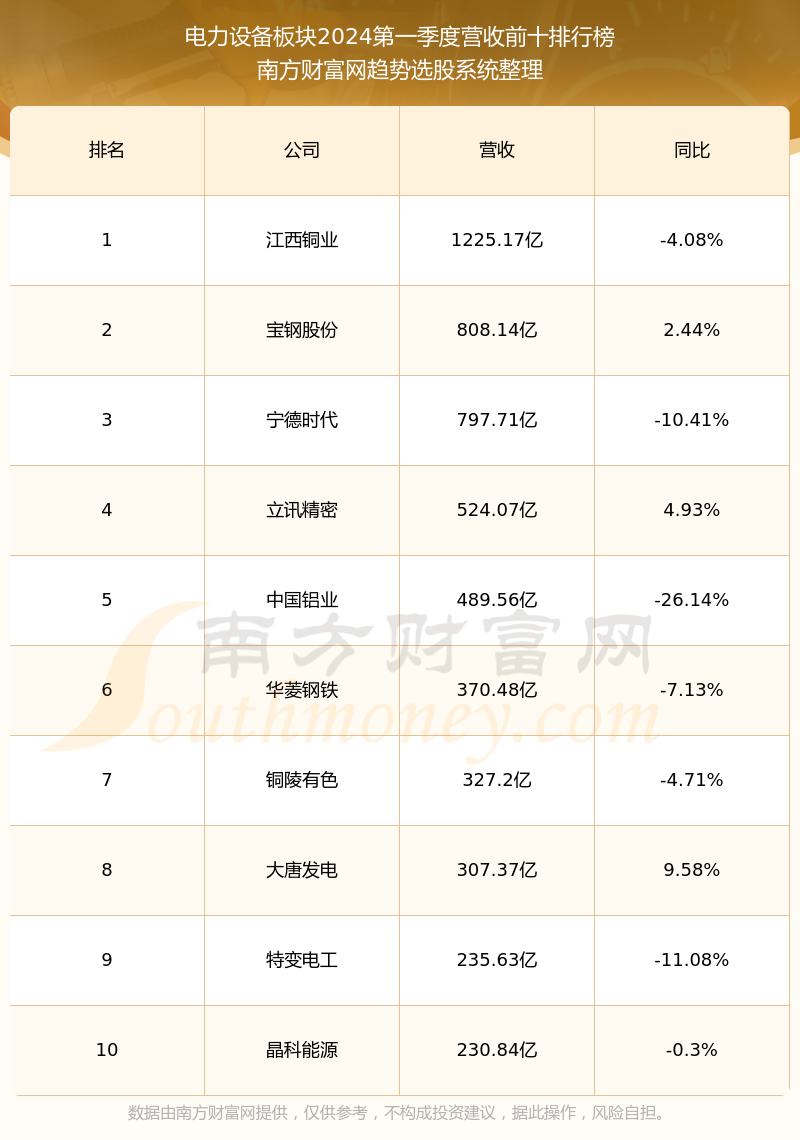 按照南方财富网趋势选股系统统计,该股所属板块为电力设备板块,该板块共有146只股票,煜邦电力2024第一季度营收在该板块中排名为第133名,该板块2024第一季度营收排名前十的股票如下表:
