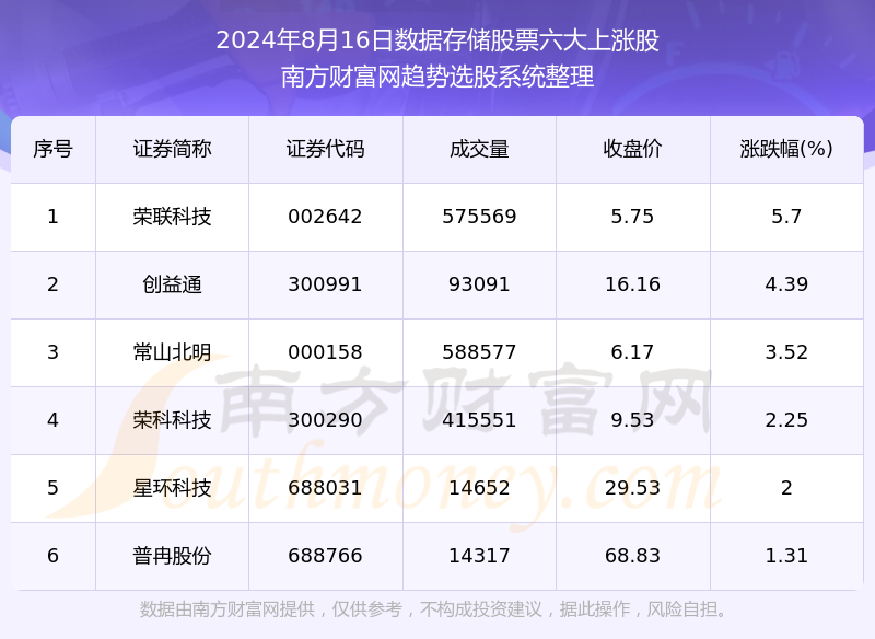 截止2024年8月16日,个股表现方面,数据存储股票中,荣联科技(002642)当日报收5.75,上涨5.7%,成交量57.56万。创益通(300991)以上涨4.39%紧随其后,该股当日成交量9.31万。此外,常山北明(000158)、荣科科技(300290)、星环科技(688031)均进入当日数据存储股票上涨股之列。