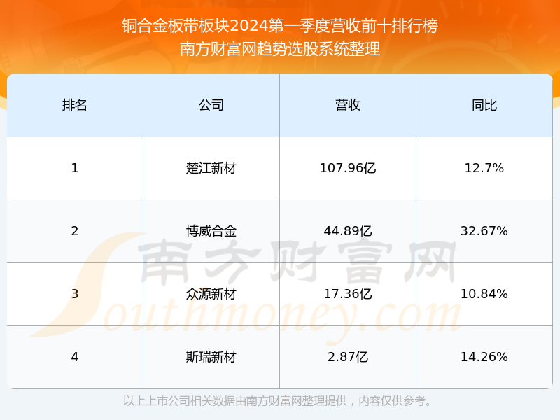 按照南方财富网趋势选股系统统计,该股所属板块为铜合金板带板块,该板块共有4只股票,鑫科材料2024第一季度营收在该板块中排名为第4名,该板块2024第一季度营收排名前十的股票如下表: