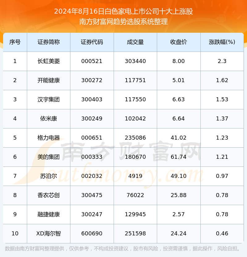 截止2024年8月16日,个股表现方面,白色家电上市公司中,长虹美菱(000521)当日报收8.00,上涨2.3%,成交量30.34万。开能健康(300272)以上涨1.62%紧随其后,该股当日成交量11.78万。此外,汉宇集团(300403)、依米康(300249)、格力电器(000651)均进入当日白色家电上市公司上涨股之列。