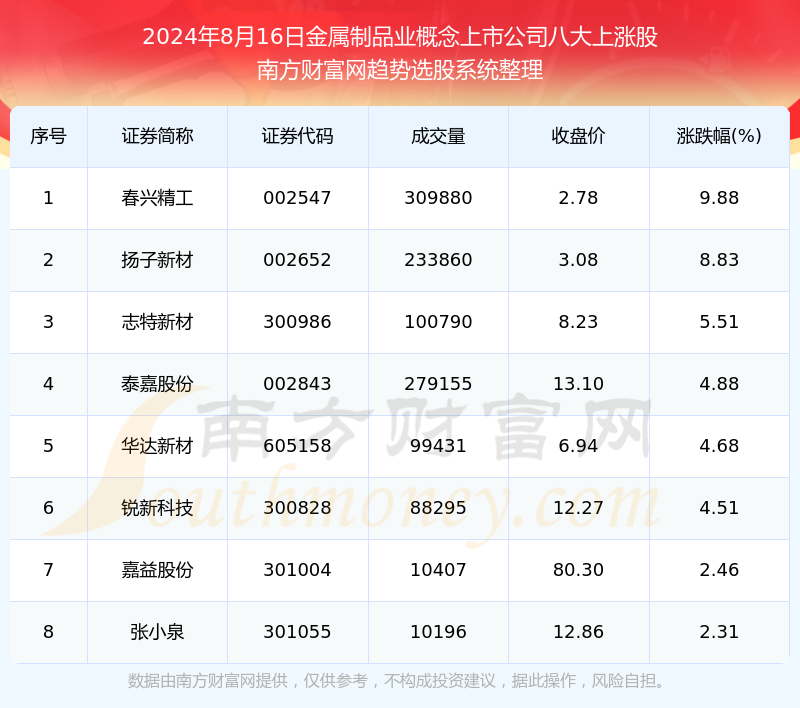 截止2024年8月16日,个股表现方面,金属制品业概念上市公司中,春兴精工(002547)当日报收2.78,上涨9.88%,成交量30.99万。扬子新材(002652)以上涨8.83%紧随其后,该股当日成交量23.39万。此外,志特新材(300986)、泰嘉股份(002843)、华达新材(605158)均进入当日金属制品业概念上市公司上涨股之列。