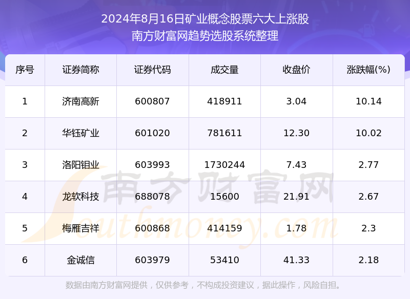 以上就是网络对正规股票配资平台 数据复盘:矿业行业概念股票六大上涨股(2024年8月16日)的解读(https://www.anancha.cn/news-pzhq/54943.html)希望可以帮助您。