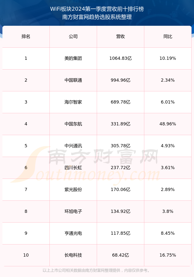 按照南方财富网趋势选股系统统计,该股所属板块为WiFi板块,该板块共有74只股票,剑桥科技2024第一季度营收在该板块中排名为第28名,该板块2024第一季度营收排名前十的股票如下表: