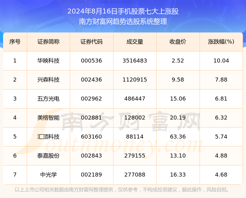 截止2024年8月16日,个股表现方面,手机股票中,华映科技(000536)当日报收2.52,上涨10.04%,成交量351.65万。兴森科技(002436)以上涨7.88%紧随其后,该股当日成交量112.09万。此外,五方光电(002962)、美格智能(002881)、汇顶科技(603160)均进入当日手机股票上涨股之列。