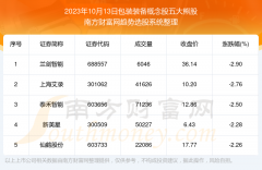 截止2023年10月13日,个股表现方面,包装装备概念股当日领跌股为兰剑智能(688557),该股当日报收36.14,上涨-2.90%,成交量0.6万。上海艾录(301062)以下跌-2.76%紧随其后,该股当日成交量4.16万。...