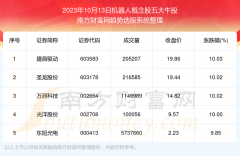 截止2023年10月13日,个股表现方面,机器人概念股当日领涨股为捷昌驱动(603583),该股当日报收19.86,上涨10.03%,成交量20.52万。圣龙股份(603178)以上涨10.02%紧随其后,该股当日成交量21.66万。...