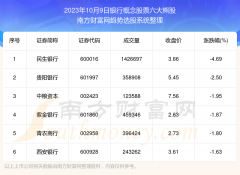 截止2023年10月9日,个股表现方面,银行概念股票当日领跌股为民生银行(600016),该股当日报收3.66,上涨-4.69%,成交量142.67万。贵阳银行(601997)以下跌-2.50%紧随其后,该股当日成交量35.89万。...