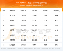 截止2024年1月2日,个股表现方面,医药行业概念股当日领涨股为*ST太安(002433),该股当日报收2.49,上涨5.06%,成交量5.27万。嘉事堂(002462)以上涨4.71%紧随其后,该股当日成交量8.51万。此外,...