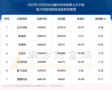 截止2023年12月29日,个股表现方面,光器件板块股票当日领涨股为五方光电(002962),该股当日报收23.47,上涨9.98%,成交量43.78万。美迪凯(688079)以上涨9.37%紧随其后,该股当日成交量26.25万。...