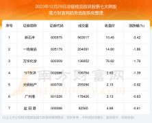 截止2023年12月29日,个股表现方面,冷链物流板块股票当日领跌股为新五丰(600975),该股当日报收10.45,上涨-3.42%,成交量56.3万。一鸣食品(605179)以下跌-1.86%紧随其后,该股当日成交量20.41万...