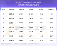 截止2023年12月22日,个股表现方面,LED应用股当日领跌股为太龙股份(300650),该股当日报收13.65,上涨-4.61%,成交量20.48万。雷曼光电(300162)以下跌-2.80%紧随其后,该股当日成交量9.48万。此外...