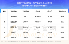 截止2023年12月21日,个股表现方面,小米产业链股票当日领跌股为日海智能(002313),该股当日报收11.54,上涨-9.98%,成交量61.44万。同益股份(300538)以下跌-2.60%紧随其后,该股当日成交量16.9...
