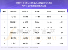 截止2023年12月21日,个股表现方面,5.5G概念上市公司当日领涨股为七一二(603712),该股当日报收30.00,上涨4.71%,成交量13.15万。联特科技(301205)以上涨4.62%紧随其后,该股当日成交量7.17万。...