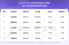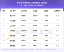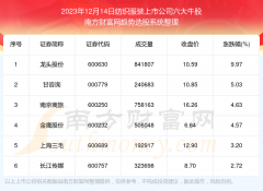 截止2023年12月14日,个股表现方面,纺织服装上市公司当日领涨股为龙头股份(600630),该股当日报收10.59,上涨9.97%,成交量84.18万。甘咨询(000779)以上涨5.03%紧随其后,该股当日成交量24.07万...