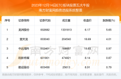 截止2023年12月14日,个股表现方面,ETC板块股票当日领涨股为龙洲股份(002682),该股当日报收6.17,上涨5.65%,成交量133.18万。楚天龙(003040)以上涨4.01%紧随其后,该股当日成交量20.45万。此外...