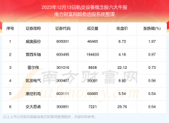 截止2023年12月13日,个股表现方面,轨交设备概念股当日领涨股为威奥股份(605001),该股当日报收6.73,上涨1.97%,成交量4.65万。晋西车轴(600495)以上涨0.97%紧随其后,该股当日成交量19.46万。...