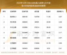 截止2023年12月13日,个股表现方面,小米机器人股票当日领涨股为埃夫特-U(688165),该股当日报收11.55,上涨5.87%,成交量12.58万。禾川科技(688320)以上涨4.48%紧随其后,该股当日成交量3.86万。...