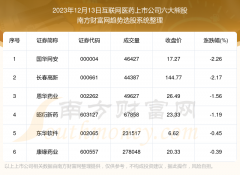 截止2023年12月13日,个股表现方面,互联网医药上市公司当日领跌股为国华网安(000004),该股当日报收17.27,上涨-2.26%,成交量4.64万。长春高新(000661)以下跌-2.17%紧随其后,该股当日成交量...