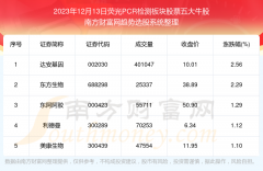 截止2023年12月13日,个股表现方面,荧光PCR检测板块股票当日领涨股为达安基因(002030),该股当日报收10.01,上涨2.56%,成交量40.1万。东方生物(688298)以上涨2.29%紧随其后,该股当日成交量2...