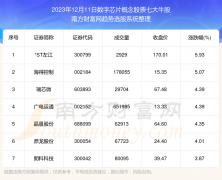 截止2023年12月11日,个股表现方面,数字芯片概念股票当日领涨股为*ST左江(300799),该股当日报收170.01,上涨5.93%,成交量0.29万。海得控制(002184)以上涨5.07%紧随其后,该股当日成交量17.81万...