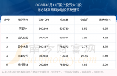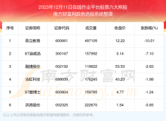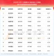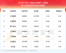 截止2023年12月11日,个股表现方面,民营银行股票当日领跌股为汇鸿集团(600981),该股当日报收3.30,上涨-7.04%,成交量161.75万。杉杉股份(600884)以下跌-3.53%紧随其后,该股当日成交量25.41万。...