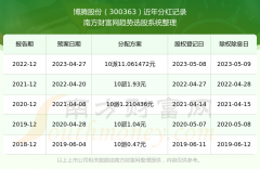一、博腾股份(300363)股票分红记录 博腾股份最新一次公布的分红方案为10派11.061472元。本次权益分派股权登记日为2023年5月8日,除权除息日为2023年5月9日,派息日为2023年5月9日。 ...