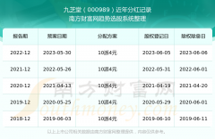 一、九芝堂(000989)股票分红记录 九芝堂最新一次公布的分红方案为10派4元。本次权益分派股权登记日为2023年6月5日,除权除息日为2023年6月6日,派息日为2023年6月6日。 近年九...