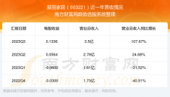 一、爱丽家居(603221)股票营收情况 爱丽家居2023年第三季度显示,公司主营收入3.5亿元,同比107.67%;归母净利润3237.93万元,同比292.02%;扣非净利润3145.23万元,同比269.16%。 爱...