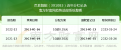 一、百胜智能(301083)股票分红记录 百胜智能最新一次公布的分红方案为10派0.35元。本次权益分派股权登记日为2023年5月23日,除权除息日为2023年5月24日,派息日为2023年5月24日。 ...