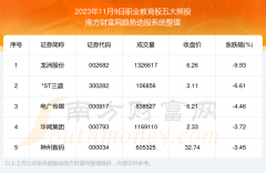 截止2023年11月9日,个股表现方面,职业教育股当日领跌股为龙洲股份(002682),该股当日报收6.26,上涨-9.93%,成交量132.66万。*ST三盛(300282)以下跌-6.61%紧随其后,该股当日成交量10.69万。此外...
