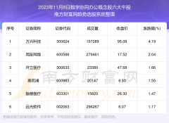 11月13日盘中南方财富网数据分析,文化数字化概念报涨,中文在线(28.22,2.82,11.1%)领涨,恒信东方(10.39,0.67,6.89%)、中广天择(19.86,0.71,3.71%)、风语筑(13.32,0.47,3.66%)等跟涨。 ...