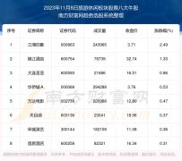截止2023年11月8日,个股表现方面,旅游休闲板块股票当日领涨股为三湘印象(000863),该股当日报收3.71,上涨2.49%,成交量24.4万。锦江酒店(600754)以上涨1.33%紧随其后,该股当日成交量7.87万。...