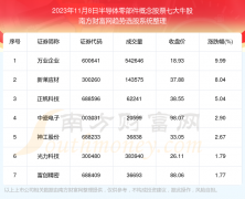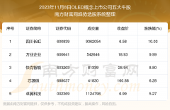 截止2023年11月8日,个股表现方面,OLED概念上市公司当日领涨股为四川长虹(600839),该股当日报收6.58,上涨10.03%,成交量936.21万。万业企业(600641)以上涨9.99%紧随其后,该股当日成交量54.26万...