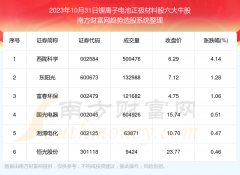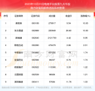 截止2023年10月31日,个股表现方面,电商平台股票当日领涨股为泉阳泉(600189),该股当日报收9.54,上涨10.03%,成交量27.98万。东方嘉盛(002889)以上涨10.00%紧随其后,该股当日成交量22.08万。此...