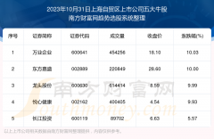 截止2023年10月31日,个股表现方面,上海自贸区上市公司当日领涨股为万业企业(600641),该股当日报收18.10,上涨10.03%,成交量45.43万。东方嘉盛(002889)以上涨10.00%紧随其后,该股当日成交量...