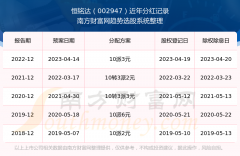 一、恒铭达(002947)股票分红记录 恒铭达最新一次公布的分红方案:10派3元。 本次权益分派股权登记日为2023年4月19日,除权除息日为2023年4月20日,派息日为2023年4月20日。 ...