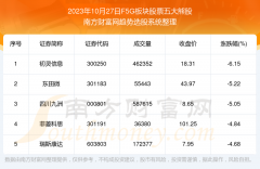 截止2023年10月27日,个股表现方面,F5G板块股票当日领跌股为初灵信息(300250),该股当日报收18.31,上涨-6.15%,成交量46.24万。东田微(301183)以下跌-5.22%紧随其后,该股当日成交量5.54万。此外...