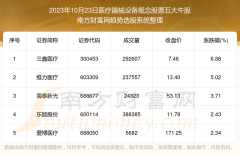截止2023年10月23日,个股表现方面,医疗器械设备概念股票当日领涨股为三鑫医疗(300453),该股当日报收7.46,上涨6.88%,成交量29.26万。维力医疗(603309)以上涨5.02%紧随其后,该股当日成交量...
