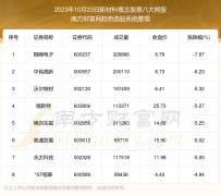截止2023年10月23日,个股表现方面,新材料概念股票当日领跌股为铜峰电子(600237),该股当日报收6.79,上涨-7.87%,成交量32.89万。中钨高新(000657)以下跌-6.23%紧随其后,该股当日成交量20.01万...