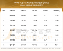 截止2023年10月23日,个股表现方面,太空互联网概念股票当日领涨股为天银机电(300342),该股当日报收16.11,上涨14.66%,成交量117.49万。三维通信(002115)以上涨10.08%紧随其后,该股当日成交量...