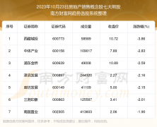 截止2023年10月23日,个股表现方面,房地产销售概念股当日领跌股为西藏城投(600773),该股当日报收10.72,上涨-3.86%,成交量5.86万。中体产业(600158)以下跌-2.83%紧随其后,该股当日成交量10...