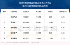 截止2024年1月15日,个股表现方面,家电板块股票当日领涨股为四川九洲(000801),该股当日报收8.30,上涨6.96%,成交量40.57万。神马电力(603530)以上涨6.76%紧随其后,该股当日成交量30.27万。此...