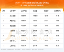 截止2023年10月19日,个股表现方面,装备智能化概念股当日领涨股为航天智装(300455),该股当日报收12.09,上涨4.49%,成交量47.03万。美腾科技(688420)以上涨1.66%紧随其后,该股当日成交量0.9万...