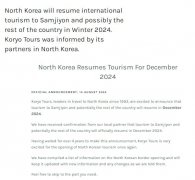 中新网8月15日电 据法新社、路透社等外媒报道,当地时间14日,与朝鲜有联系的高丽旅行社(Koryo Tours)表示,朝鲜或将在2024年底重新开放国际旅行。 图片来源:高丽旅行社声明截图 ...