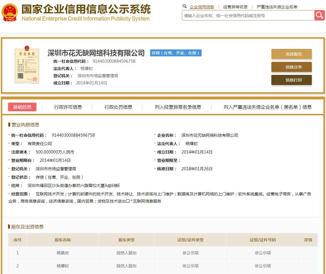 | 公司名称 | 深圳市花无缺网络科技有限公司 | 信用代码 | 91440300088459675B |