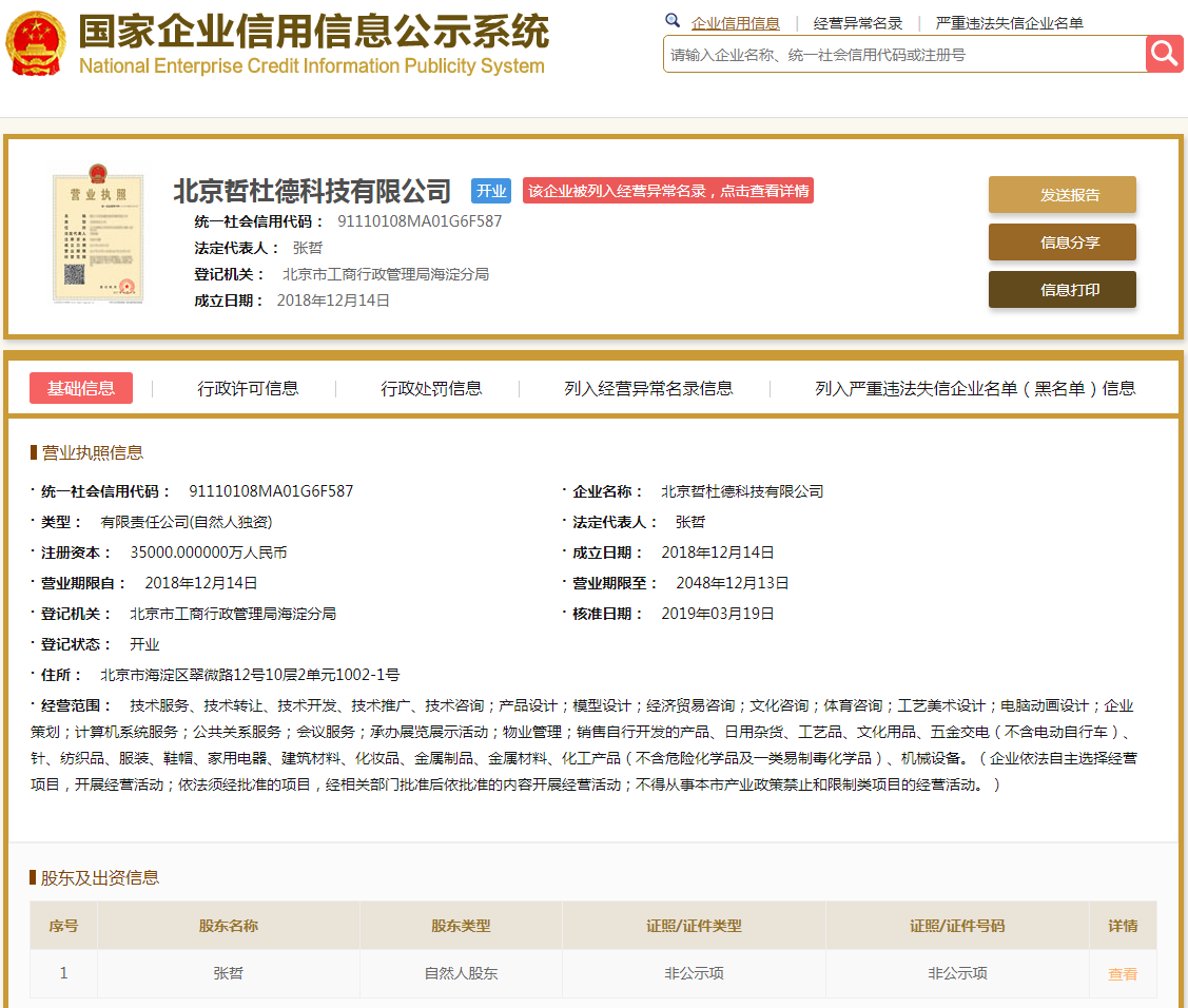 | 公司名称 | 北京哲杜德科技有限公司 | 信用代码 | 91110108MA01G6F587 |