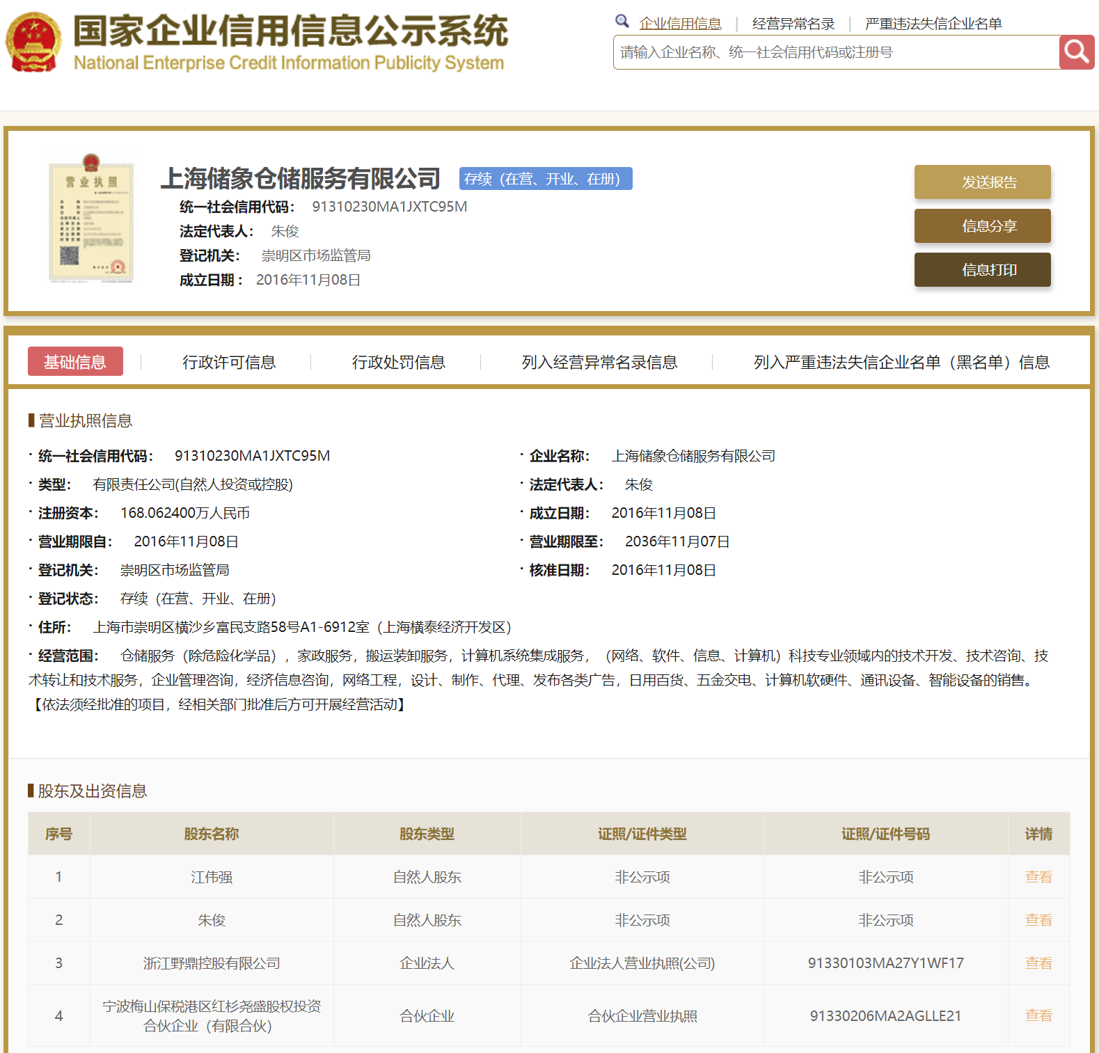 | 公司名称 | 上海储象仓储服务有限公司 | 信用代码 | 91310230MA1JXTC95M |
